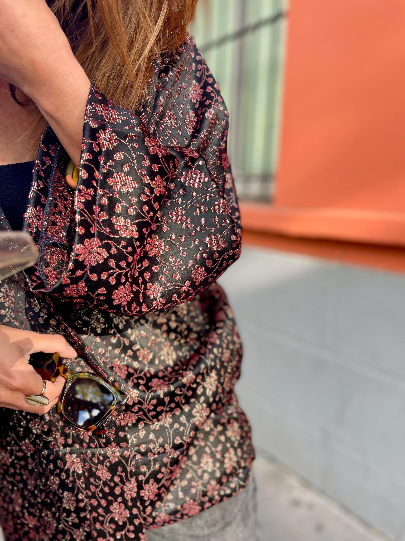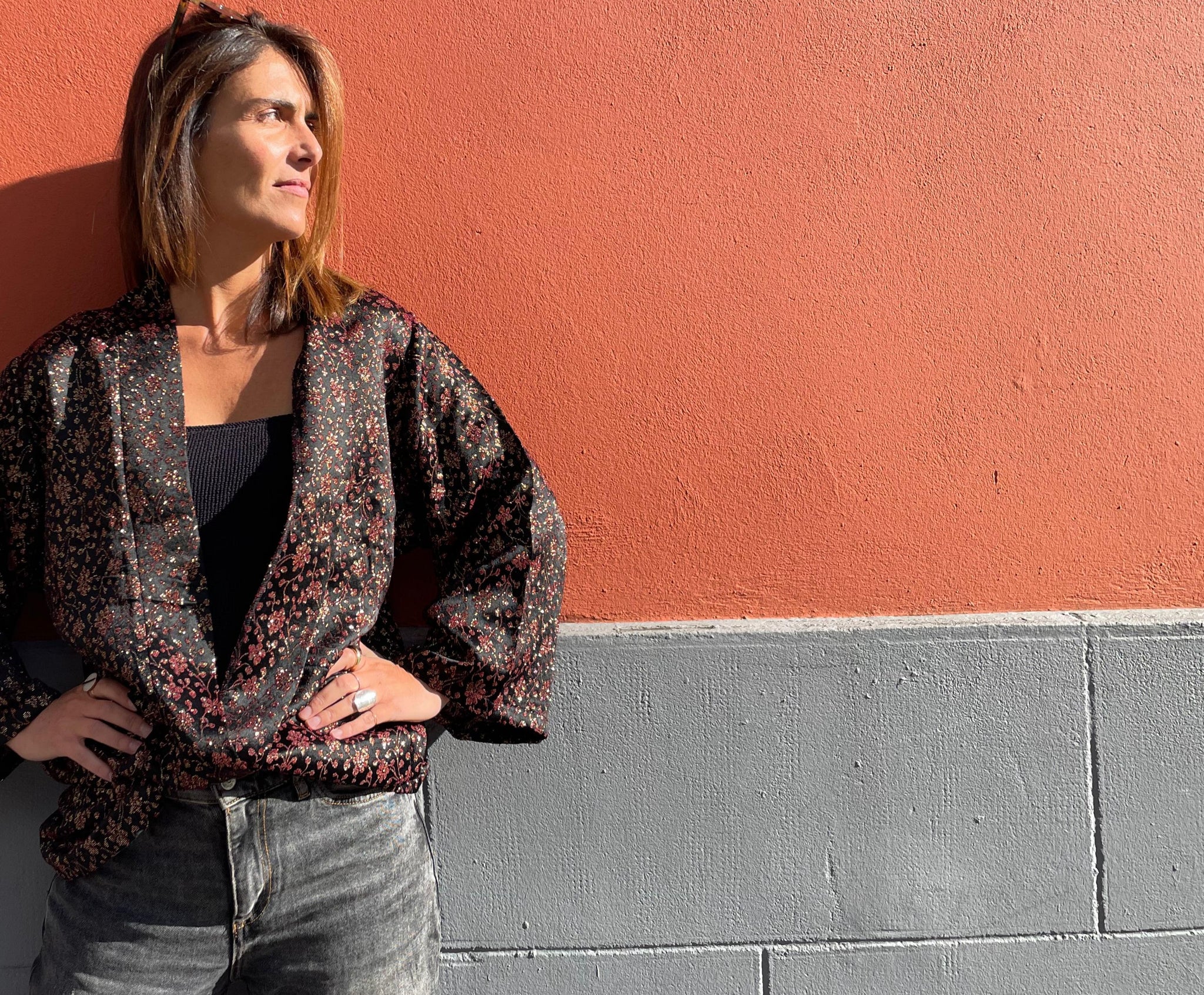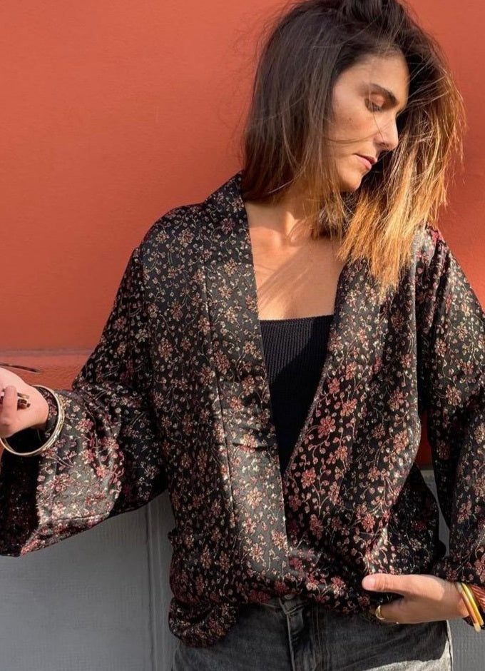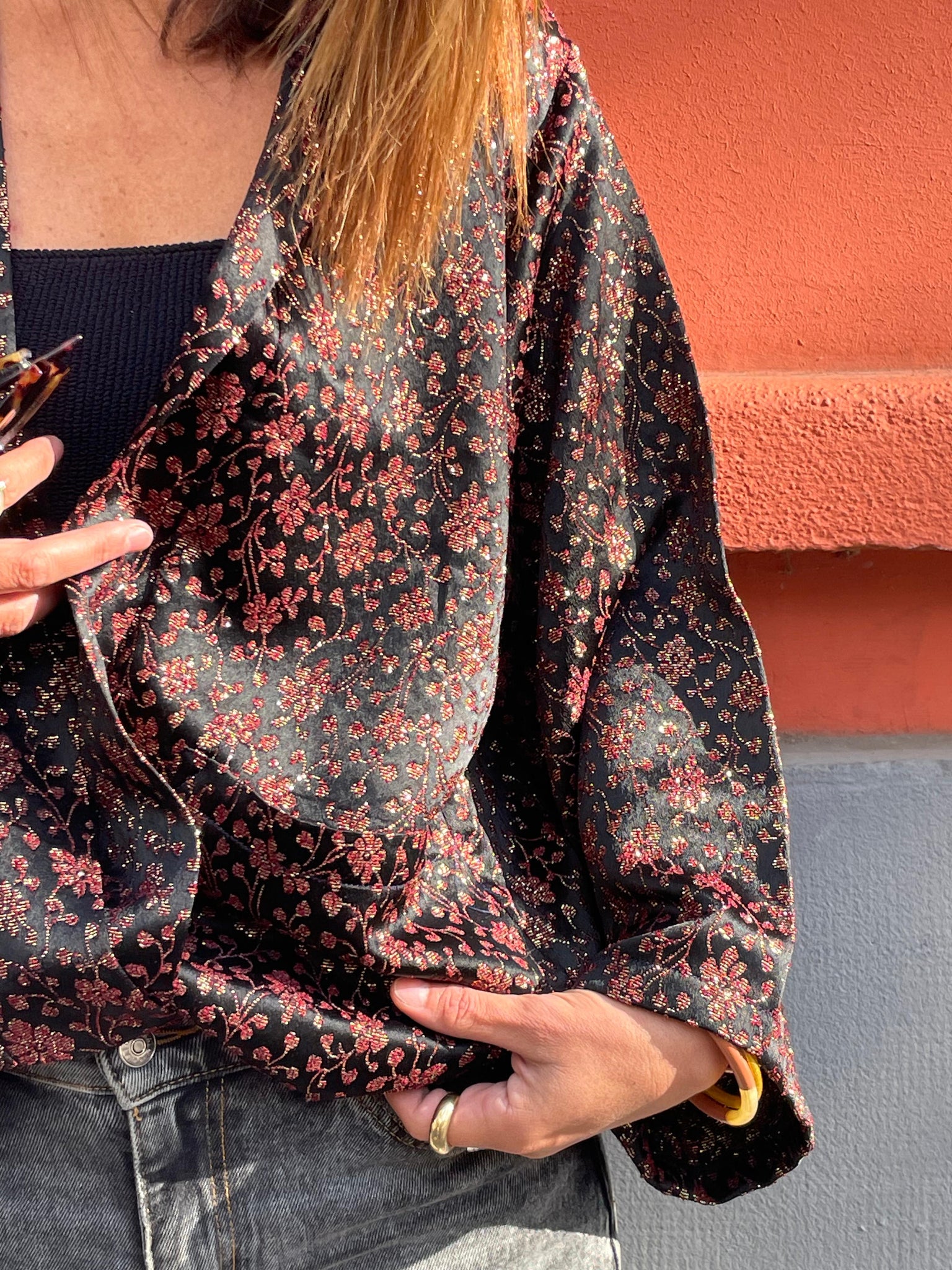 La veste kimono Marine est confectionnée à partir d'un Jacquard souple ultra élégant. Tissu Jacquard 100% coton et lurex de fabrication française de la maison Deveaux. Ce kimono peut se porter ouvert mais aussi rentré dans un pantalon pour un effet blouse.